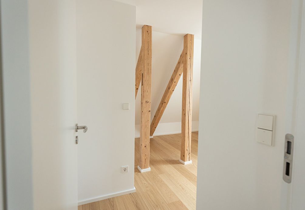 Dachausbau mit Sichtbalken aus dem Altbestand.