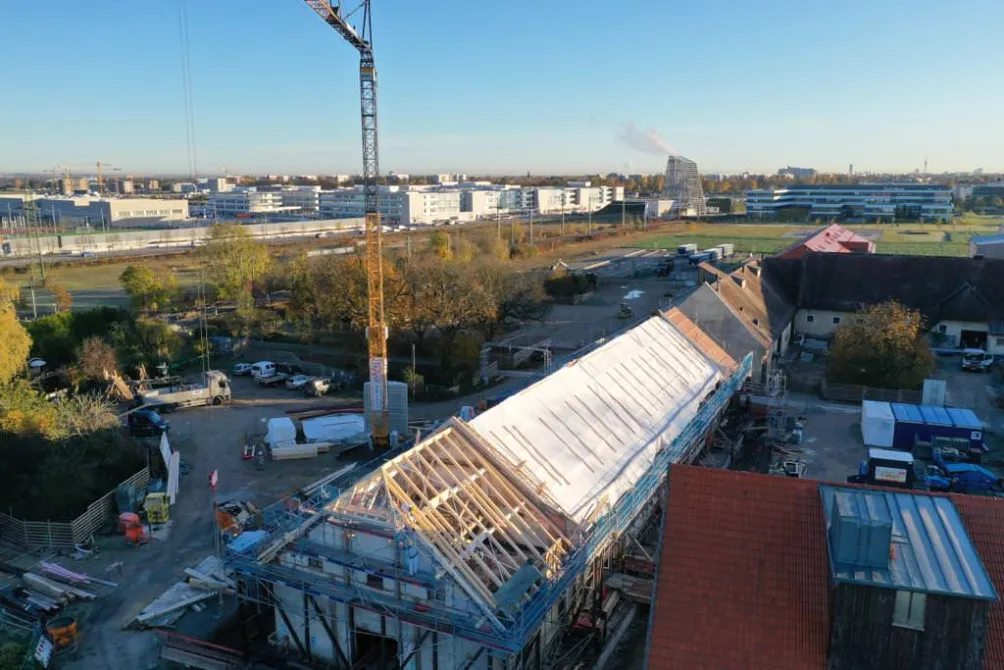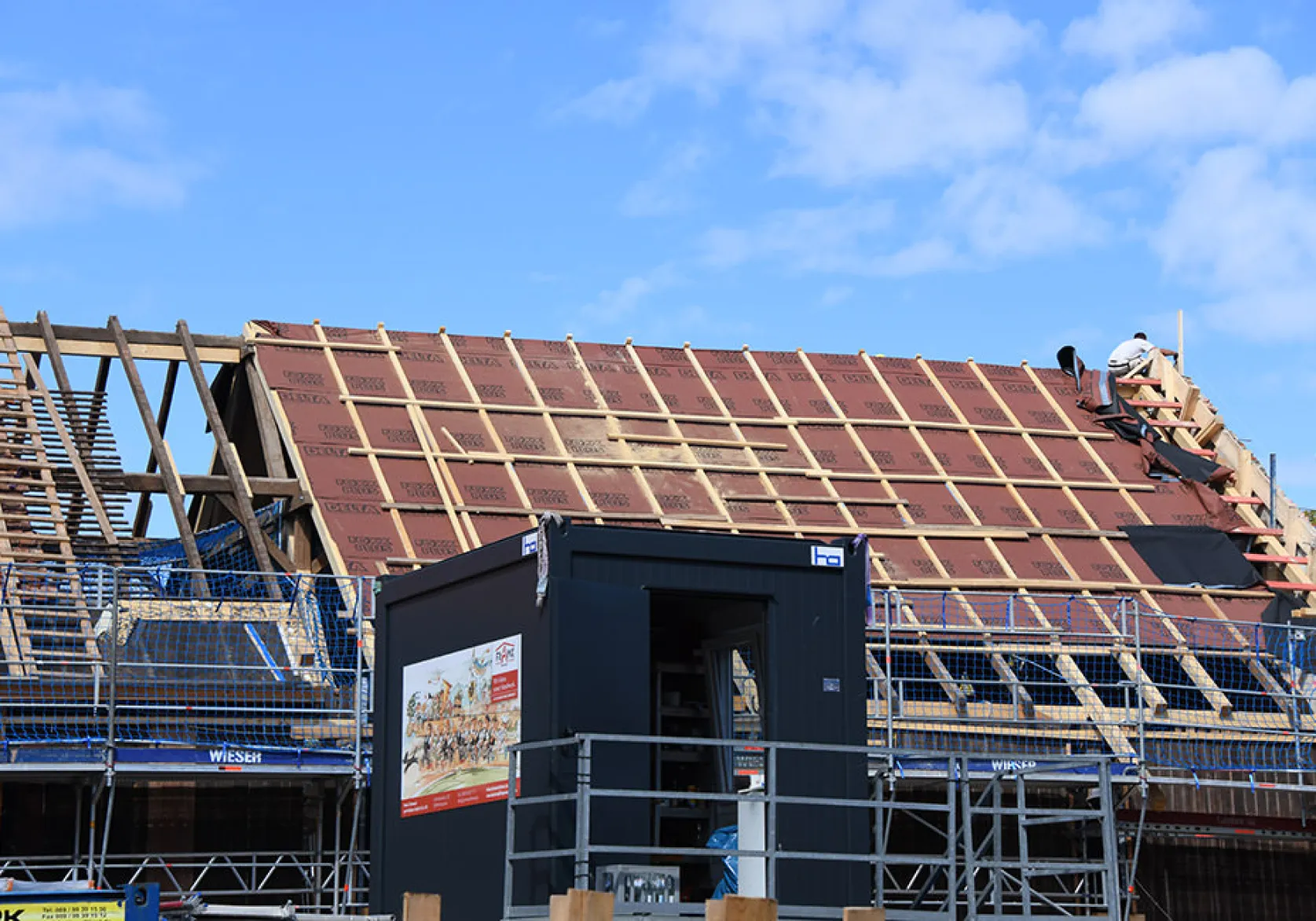 • Wiederaufbau der Dachstühle an den Kopfbauten nach den Angaben des Denkmalschutzes