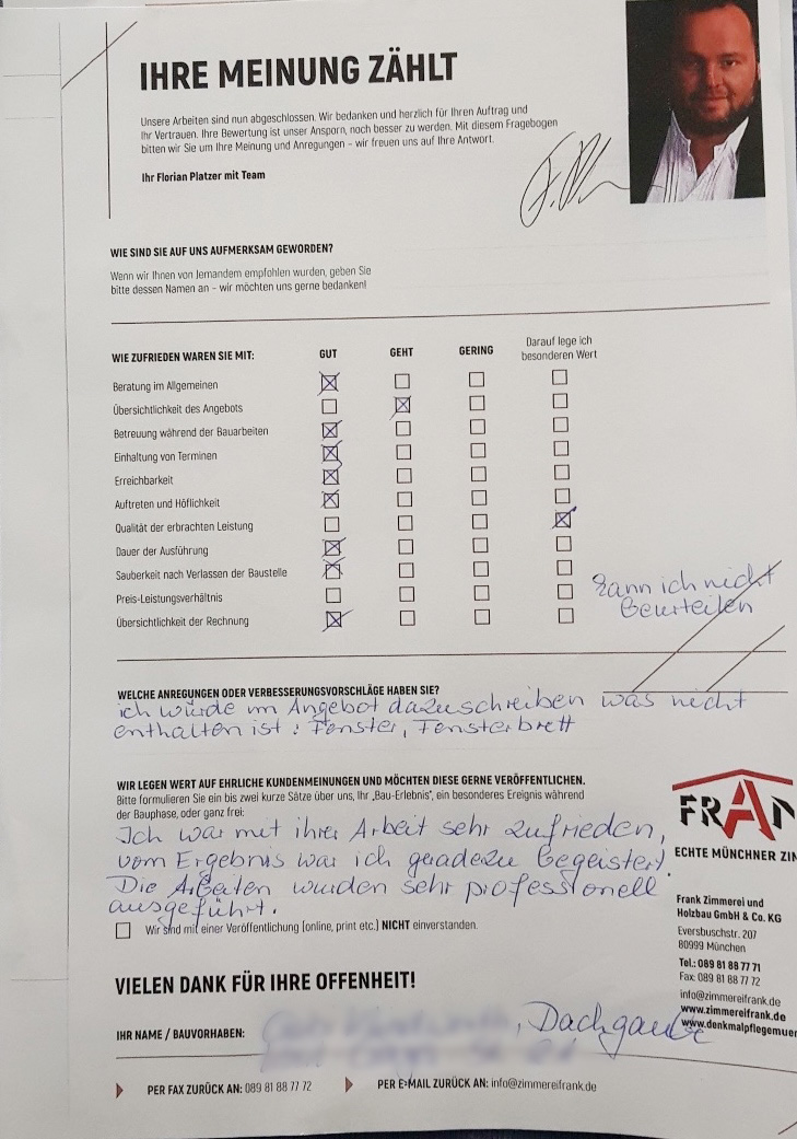 KILMARX-FRANK Zimmerei Muenchen - Blockzitat Anführungszeichen Sehr geehrter Herr Frank, meine Frau, meine Kinder und ich, wir möchten uns nochmals bei Ihnen und Ihren Mitarbeitern ganz herzlich für die hervorragende Leistung und die angenehme Zusammenarbeit bedanken. KILMARX-FRANK Zimmerei Muenchen - Blockzitat Anführungszeichen